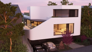 Do úzkeho svahovitého pozemku sme umiestnili dve nadzemné podlažia a jedno podzemné. V podzemnom sa nachádza garáž a obslužné priestory, horné podlažia slúžia na príjemné bývanie.