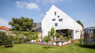 Hmota domu je čistá, archetypálna, sochárska s dôrazom na vyváženú, ale stále dynamickú kompozíciu otvorov s akcentom „vykusnutia“ vo vchodovej časti domu. Čistote tvaru pomáha aj prevetrávaná biela fasáda a strecha z Equitonu kombinovaná s dreveným obkladom z garapy z ktorej je aj terasa a uličné oplotenie.